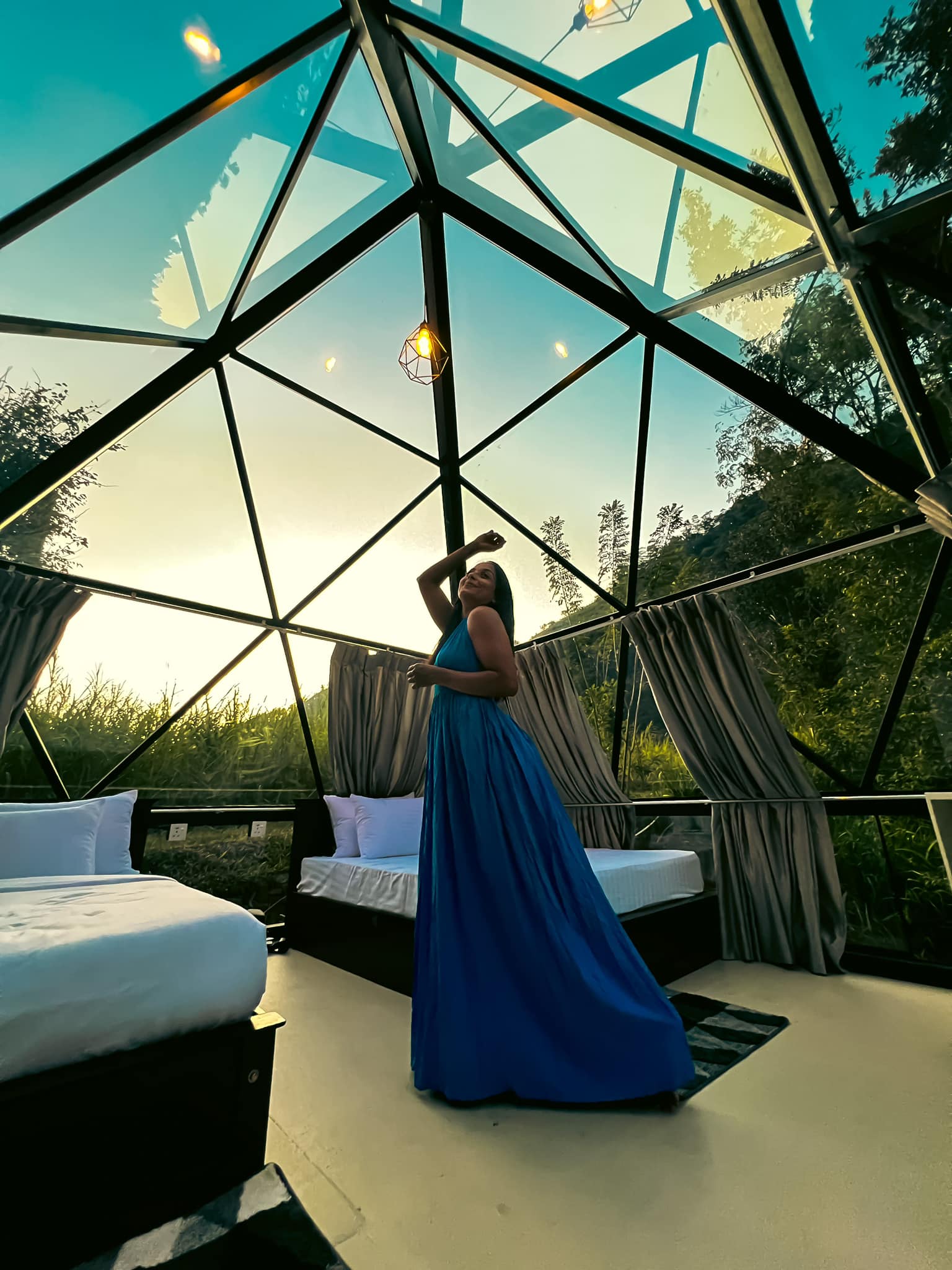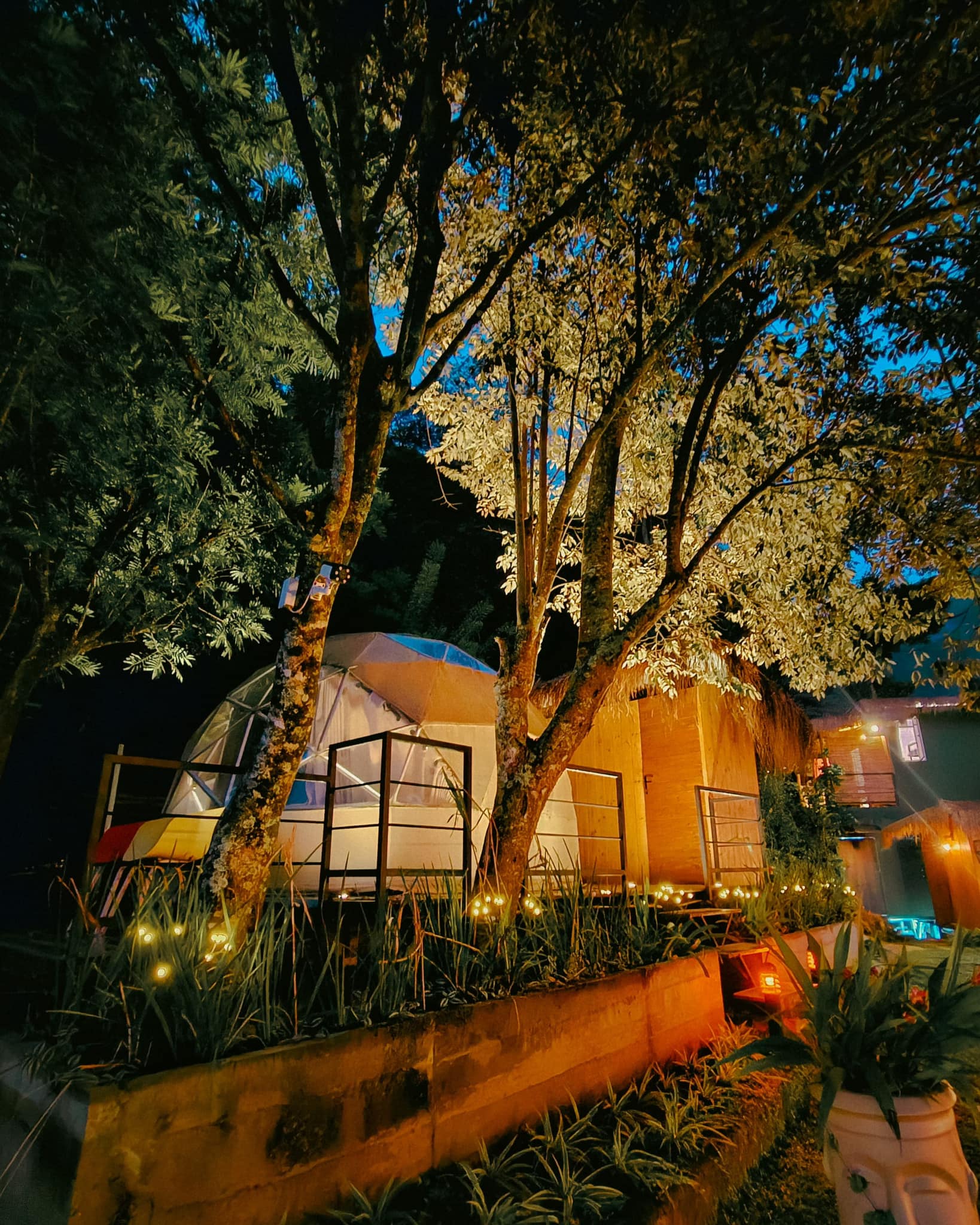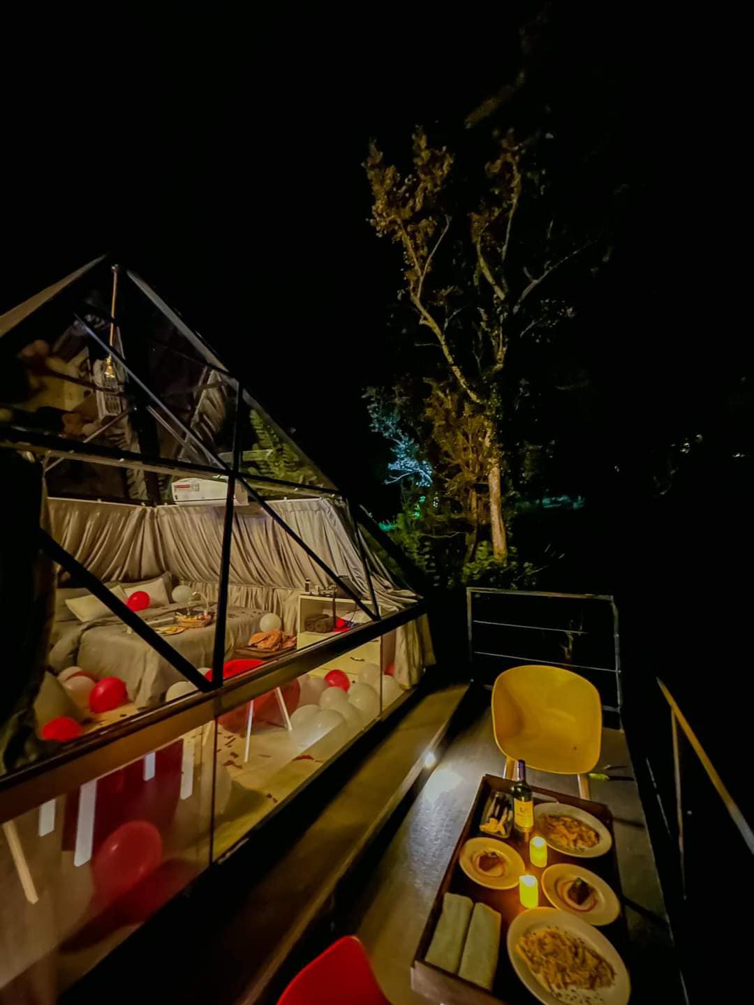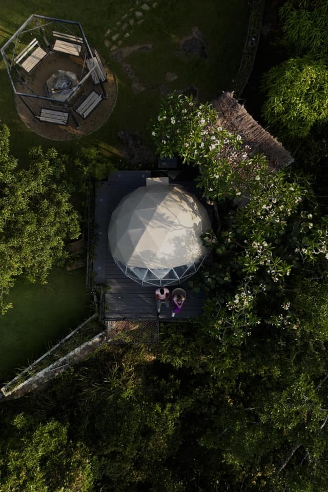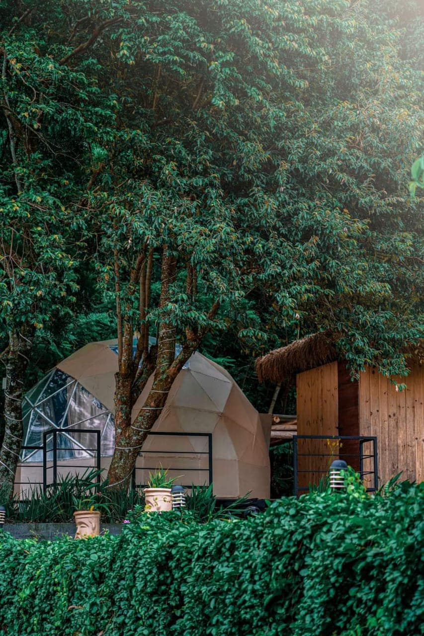 The accommodations consist of two types of domes: geo domes and pyramid domes. These are beautifully designed, eco-friendly, and fully equipped with private facilities including toilets and hot showers. The beds are super comfy with plush upholstery to ensure a restful sleep. The design blends luxury with nature, providing a unique glamping experience that balances comfort and the outdoors